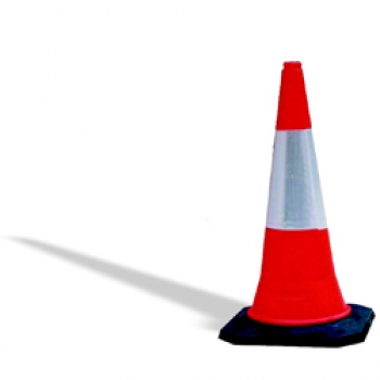 Κώνος οδοσήμανσης από πολυαιθυλένιο (PE) σε πορτοκαλί χρώμα, μαλακός με μία μεγάλη αντανακλαστική ταινία και μαύρη βάση.